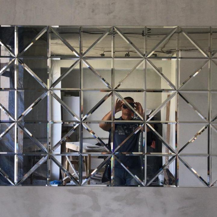 • Зеркальное панно в салоне, Москва, серебристая зеркальная плитка "восьмиугольник" и золотистая зеркальная плитка квадратной формы